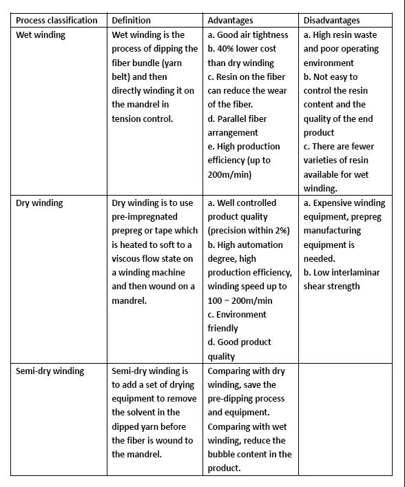 Among all the processes, wet winding is the most common application. Dry winding is only applied in high-performance, high-precision and high-end aerospace technology.