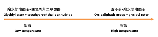 ● 固化反应机理:在无催化剂的情况下即使温度高达200℃,环氧基与酸酐的反应也很迟钝。酸酐通过与体系内的羟基反应来固化双酚A类环氧树脂,固化反应速度与羟基浓度成正比。